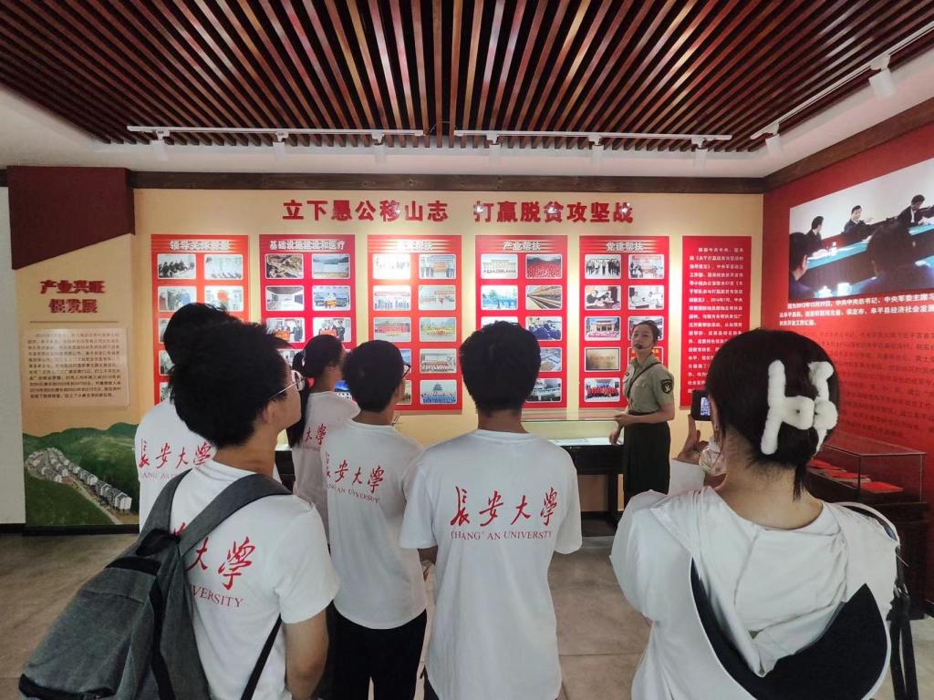 实践队一行先来到了店房村史馆进行参观学习。馆内的内容分三个主题呈现:一、红色店房,峥嵘岁月。抗战时期,晋察冀军区教导团、战地医院等都曾在店房驻扎,店房村民热烈拥护革命,为抗日战争时期对敌斗争做出了巨大贡献。党支部成立后,店房的历任村支书先后参加抗日战争,扶贫攻坚战等,都是店房当之无愧的“好战士”。二、光荣传统,温情年代。新中国成立以后,店房村的文艺活动空前高涨;国民经济恢复时期,店房村响应毛主席号召,兴起“农业学大寨”运动;2019年,在易地扶贫搬迁政策引导下,店房村坚持走城乡融合发展道路,把13个原始村落集中形成现今的店房小区。三、产业兴旺促发展。2016年7月,中央军委国防动员部确定帮扶店房村,与地方各单位广泛开展教育、产业、党建帮扶。如今,店房村拥有了自己的企业,大片的枣园,以及独具特色的旅游项目,解决了店房村民的收入以及就业问题,村民的日子有了盼头。回望来路,店房人坚定地说:“脱贫攻坚,党是最大的靠山,也是永远的靠山。”