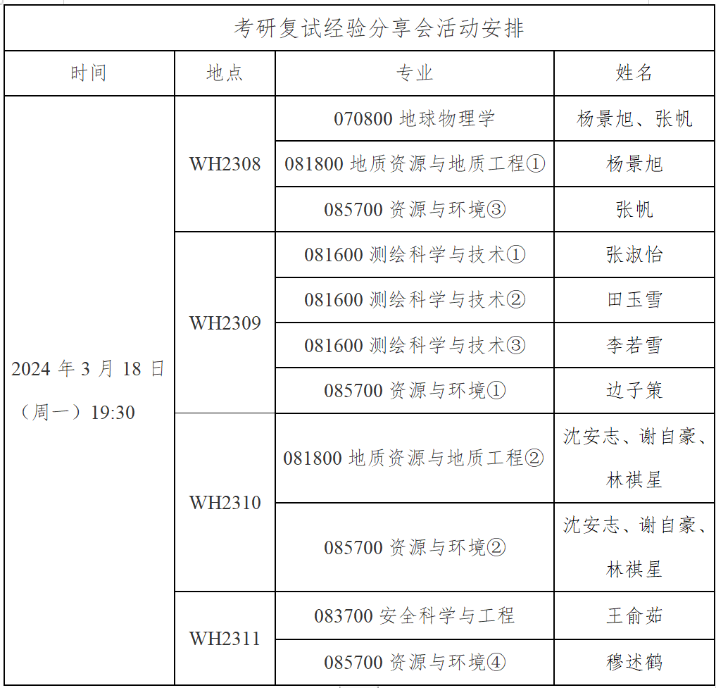 不要担心!为了帮助广大考生更好地备战复试,解决心中的“不知道”,特邀请到地测学院优秀的研究生学长学姐们来为大家答疑解惑,分享他们在考研复试中的心得与体会,为即将踏上复试之路的考生们提供宝贵的参考。学长学姐们将从多个维度深入剖析考研复试的各个环节,分享面试技巧、专业素养展示以及应对紧张情绪等实用经验。他们将以亲身经历为例,讲述如何在复试中展现出自己的独特魅力,赢得导师的青睐。各位准研究生们也可以借此机会向学长学姐们请教问题,共同探讨考研复试的奥秘。
