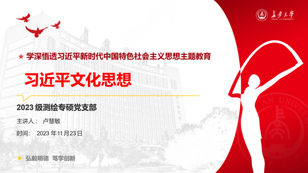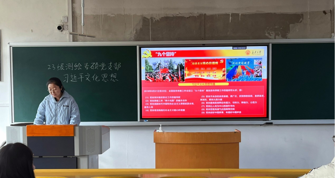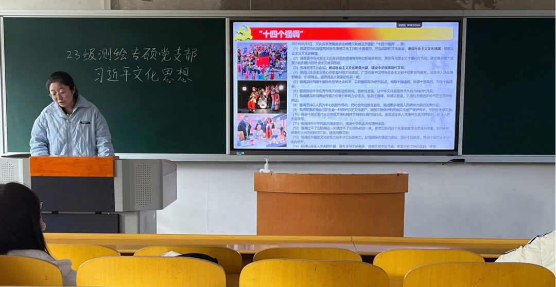 2023年10月7日至8日,全国宣传思想文化工作会议在北京召开。会议最重要的成果就是首次提出了习近平文化思想。习近平新时代中国特色社会主义思想的文化篇,在马克思主义中国化时代化进程中浓墨重彩、熠熠生辉。近日,地测学院2023级测绘专硕党支部以“习近平文化思想”为主题,进行针对性学习。此次主题学习由党支部书记卢慧敏同志进行讲解,全体党支部成员参与学习。