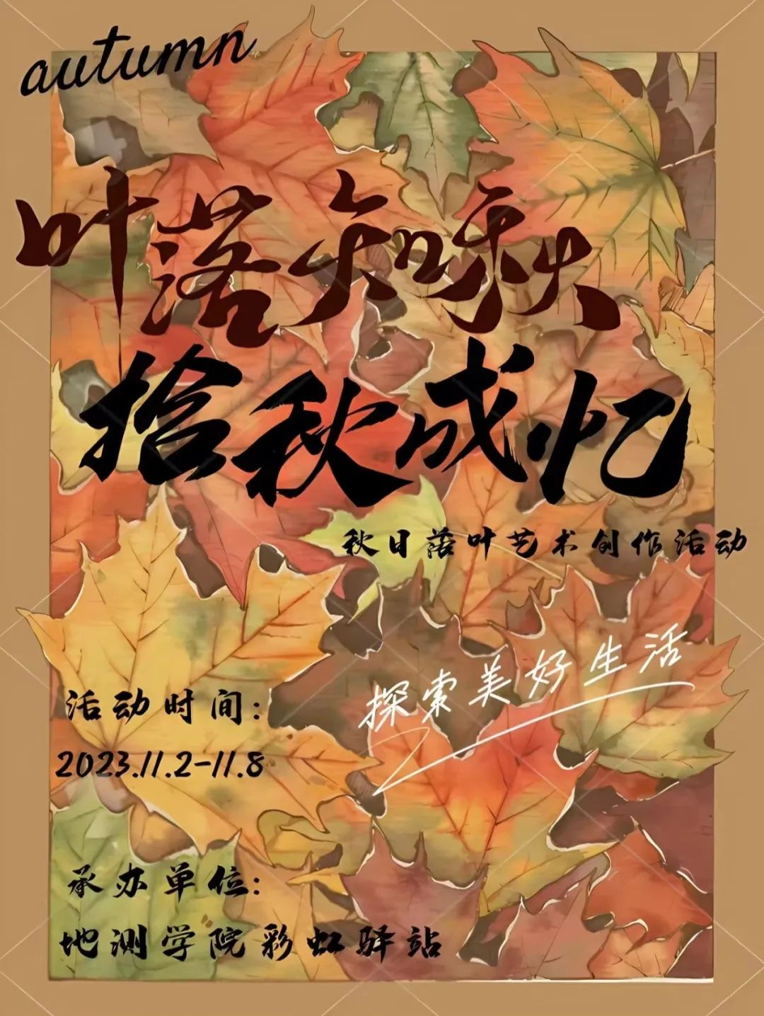 为了丰富同学们的课余生活,在发现秋天美景的同时提升同学们的动手能力。地测学院彩虹心理协会面向全校学生于2023年11月2日至2023年11月8日期间成功举办了“拾秋成忆,落叶知秋”艺术创作活动。