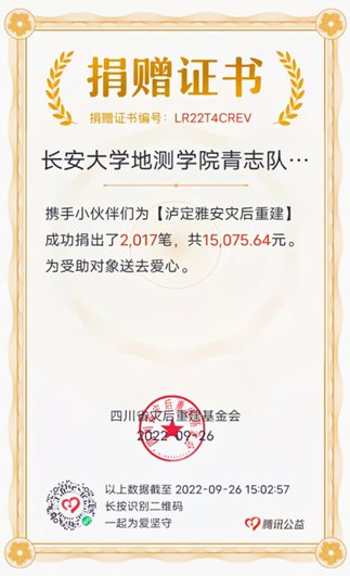 2022年9月5日,四川甘孜州泸定县发生6.8级地震,国家地震应急三级响应!国家四级救灾应急响应!得知此消息,地测学院青年志愿者服务队在第一时间寻找相关募捐机构,在成功找到相关渠道后,以地测学院青志队组织的名义开展募捐活动。此次活动受到同学们的大力支持与赞扬,截至9月24日22:37,米兰milan中国地测学院青志队一共成功为四川省灾后重建基金会募集捐款2017笔,共15075.64元。