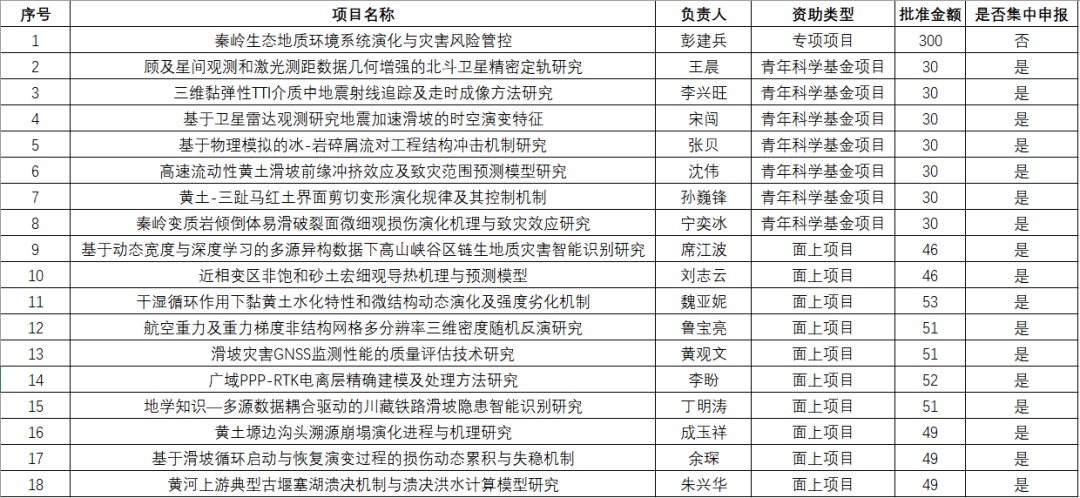 近日,国家自然科学基金委公布了2023年度国家自然科学基金项目评审结果。在学院教职工的共同努力下,我院2023年度国家自然科学基金项目共获批18项,彭建兵院士获批重点专项项目1项,集中获批面上项目10项,青年基金项目7项,资助项目经费总额1007万元。