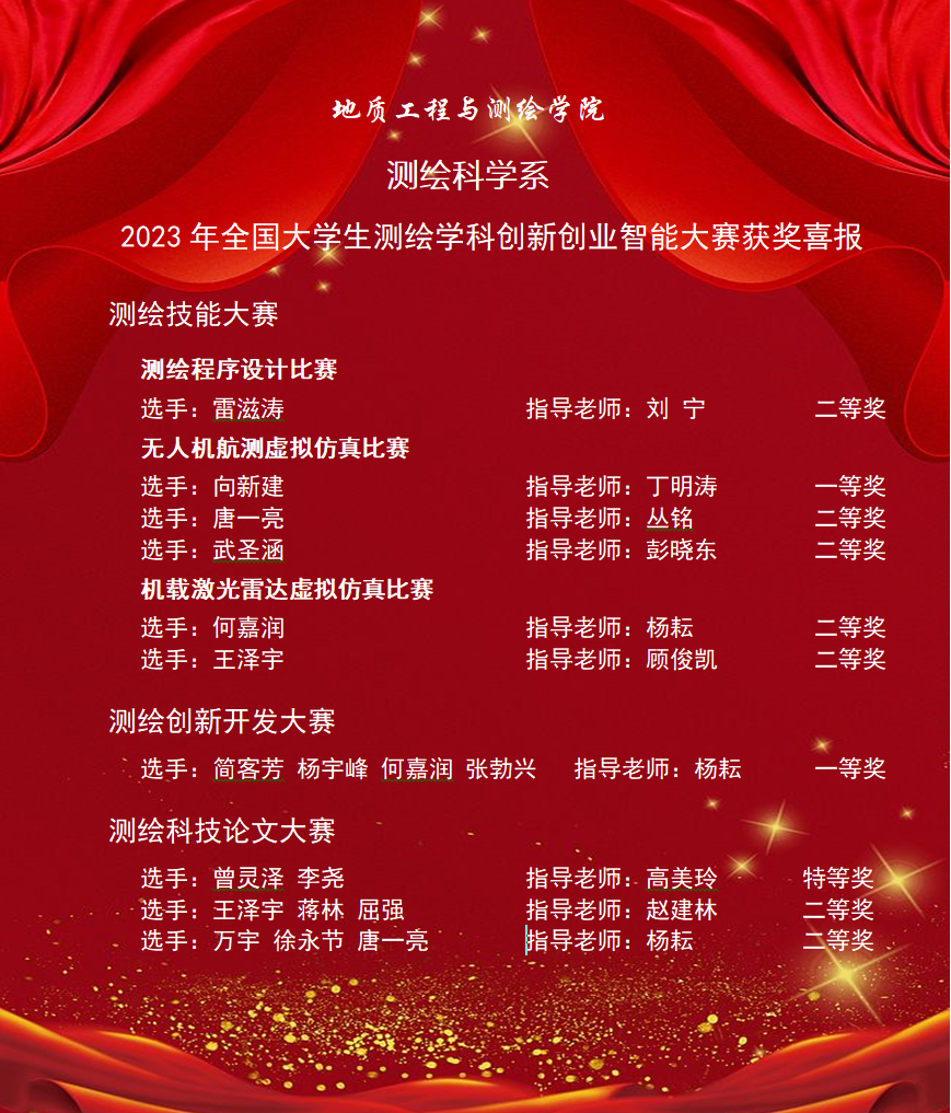 我院测绘科学系对本次竞赛活动高度重视,赛前精心组织,广泛宣传,组成20名指导教师和44名参赛选手的竞赛队伍,通过层层选拔,精准指导,历时2个多月的积极训练,模拟演练,最终取得优异成绩。此次竞赛活动的参与,增强了学生的创新创业意识,提升了实践动手水平,促进了学生知识、能力、素质的协调发展,践行了“以学生为中心、以产出为导向”的育人理念,达到了以赛促学、以赛促教、以赛促改的目的。