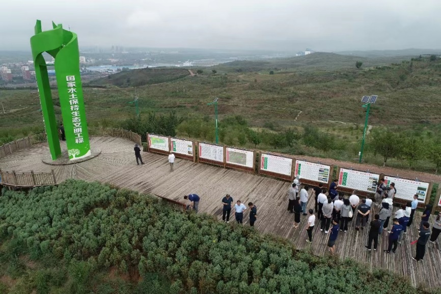 实践队第二站前往辛店沟水土保持示范园,实践队员在黄河水利委员会工作人员的带领下,先后参观了园区水土保持文化展厅、“三道防线”小流域综合治理模式、小石沟气象园、柔性溢洪道试验坝、育林沟水土流失规律观测径流小区,并现场就水土保持与生态环境建设高质量发展进行了深入交流与讨论。