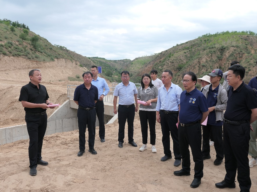 实践队员在榆林市政府相关负责人的带领下,来到了佳县朱官寨镇冯家圪崂村,考察当地的中型拦沙坝建设。