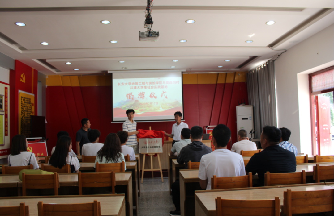 实践队代表丁光盛展示了本次社会实践的实践成果,带队指导老师王儒豪对此次社会实践做了总结,对各位领导的帮助关怀表示衷心的感谢,对实践期间各位实践队员的工作成果表示肯定,对建立大学生社会实践基地后地测学院与高西沟村的良好合作致以美好祝愿。最后,高西沟村工作专班周文东主任、高西沟村村民委员会主任高治前及地测学院辅导员老师王儒豪共同为基地揭牌。