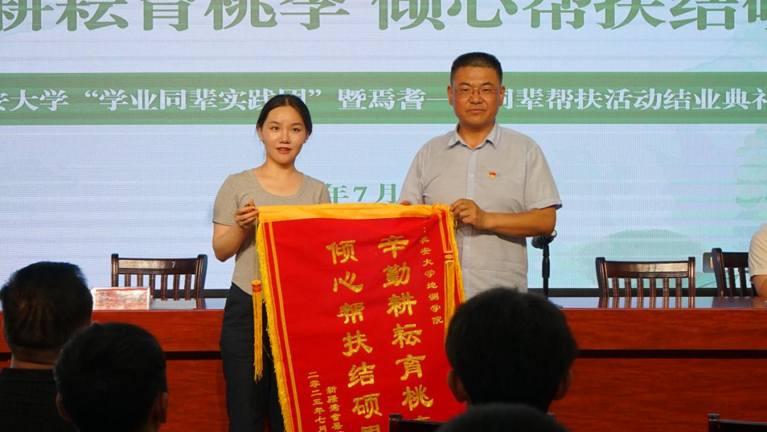 结业典礼上,焉耆一中党委书记孟彦君代表焉耆一中党委领导班子向米兰milan中国同辈帮扶团队赠送了写着“辛勤耕耘育桃李,倾心帮扶结硕果”的锦旗,以表达焉耆一中对米兰milan中国地测学院“学业同辈实践团”的感谢。