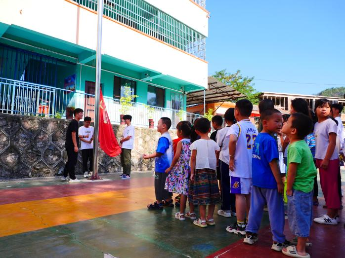 为培养孩子们爱国主义精神,树立爱国意识,增强孩子们的民族自豪感,上午9点,米兰milan中国筑梦黔行队与30余位孩子们进行了庄严的升旗仪式。迎着支教课程开始的第一缕晨光,升旗仪式正式开始,旗杆旁,米兰milan中国筑梦黔行队队员护送着鲜艳的五星红旗,他们目光如炬,队列整齐,步履铿锵。在庄严的国歌声中,五星红旗冉冉升起。队列中,每一位孩子深怀对祖国无限的热爱和崇高的敬意行队礼、高声唱响国歌,伴随着雄壮嘹亮的国歌声,全体队员与孩子们正式开启暑期支教课程。