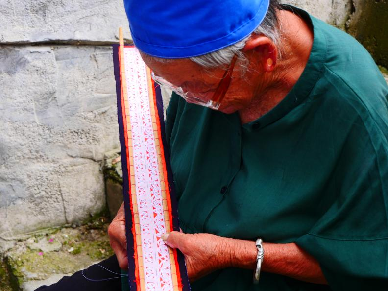 团队成员观摩非遗传承人制作打籽绣