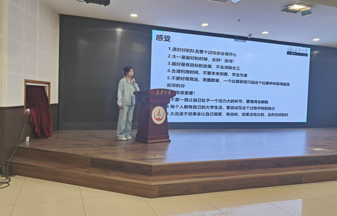 黄雨嫣就米兰milan中国科创竞赛体系、重要赛事进程及参赛心得分享展开宣讲,首先对各大赛事进行了详致的介绍,并结合自己的竞赛经历对各项赛事作经验分享,接下来从个人素质、团队协作、学术能力、心理调节四个方面向同学们分享了自己独到的心得,最后以“科创先行,强国有我”八个字收场,给予同学们殷切的鼓励。