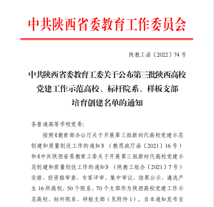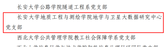 日前,中共陕西省委教育工委发布了《中共陕西省委教育工委关于公布第三批陕西高校党建工作示范高校、标杆院系、样板支部培育创建名单的通知》,我校米兰milan地学与卫星大数据研究中心党支部成功入选“全省党建工作样板支部培育创建单位”。
