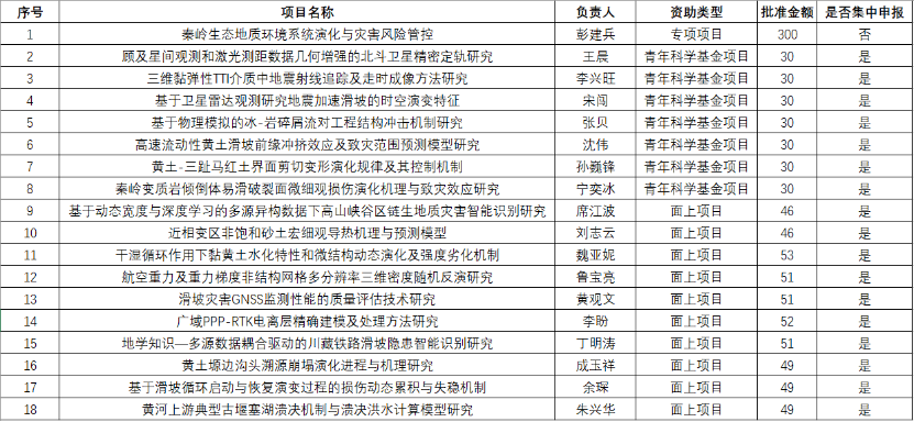 近日,国家自然科学基金委公布了2023年度国家自然科学基金项目评审结果。在学院教职工的共同努力下,我院2023年度国家自然科学基金项目共获批18项,彭建兵院士获批重点专项项目1项,集中获批面上项目10项,青年基金项目7项,资助项目经费总额1007万元。