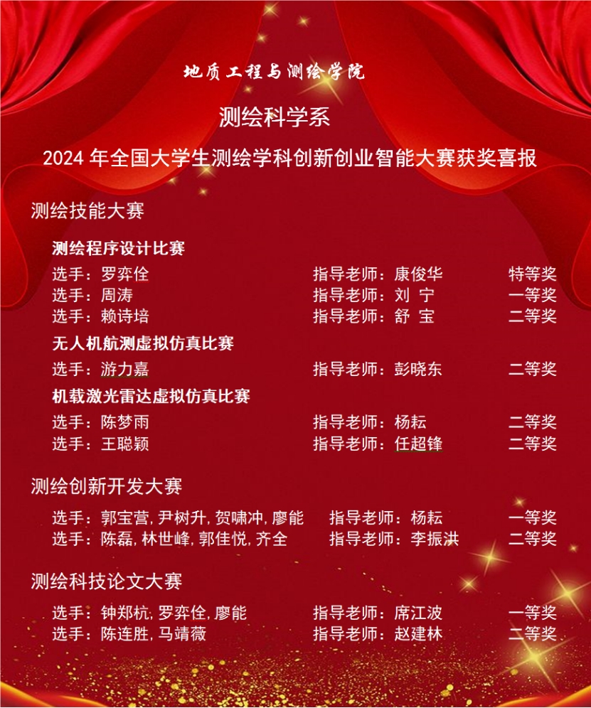 在快速变化的知识经济时代,测绘类专业的人才培养也面临全新的挑战和机遇。在新形势下,测绘类教育紧密围绕国家重大战略需求,主动开展专业升级改造,积极创新办学思路和教学模式。我校测绘学科以专业竞赛为驱动,扎实推行本科导师制与《测绘创新开放实践》教学改革,增强学生的创新创业意识,提升实践动手能力,达到以赛促学、以赛促教、以赛促改的人才培养目标。