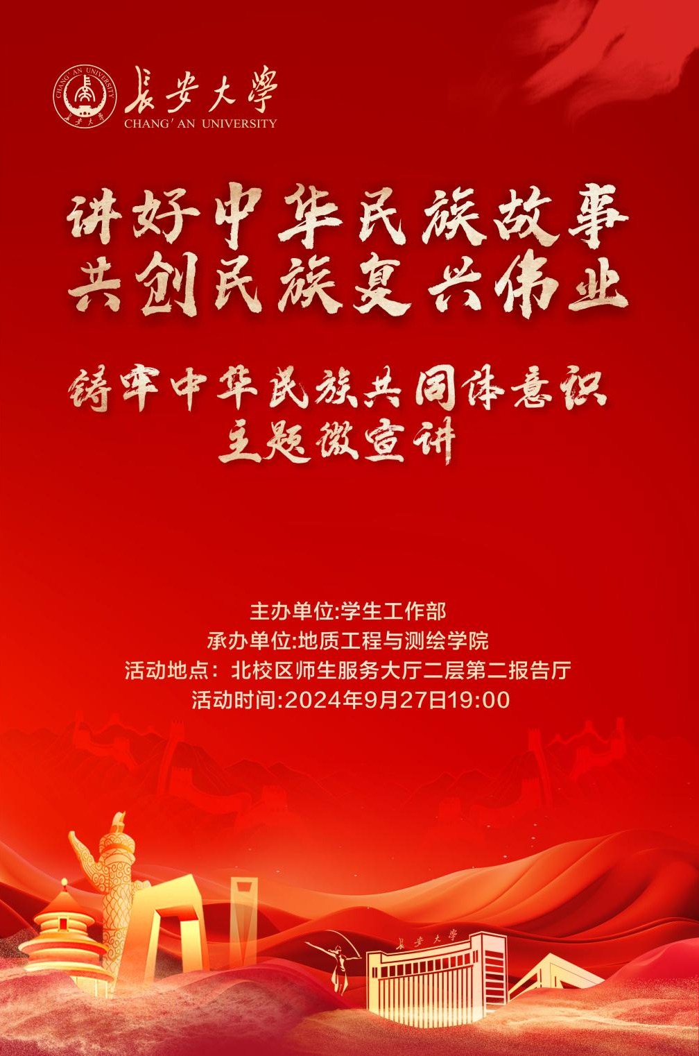 为深入贯彻落实党的二十大和二十届二中、三中全会精神,深入学习贯彻习近平总书记关于加强和改进民族工作的重要思想,教育引导各族青年学生讲好中华民族故事,牢固树立正确的中华民族历史观,牢固树立休戚与共、荣辱与共、生死与共、命运与共的共同体理念,根据陕西省民宗委《关于举办第二届陕西省高校大学生铸牢中华民族共同体意识主题微宣讲比赛的通知》,在前期学院推荐、复赛评审的基础上,9月27日将举办我校“铸牢中华民族共同体意识主题微宣讲”校内选拔赛决赛。