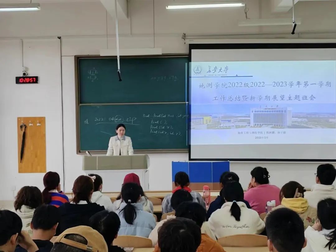 为全面落实立德树人根本任务,聚焦本科人才培养质量提升,夯实新生教育工程,2023年3月23日上午10:00,地测学院2022260201、2022260202班于鸿远1306教室开展了2022-2023学年第一学期工作总结暨新学期展望主题班会,此次班会由2022级辅导员韩树鹏、陈子毅主持,班主任刘国华、董怀民及58名本科生共同参与。