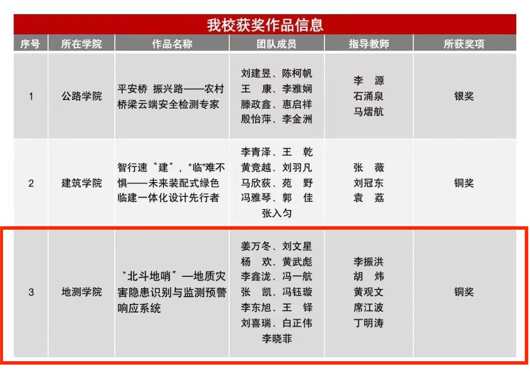该作品由我院姜万冬、刘文星、杨欢、黄武彪、李鑫泷、冯一航、张凯、冯钰璇、李东旭、王铎、刘喜瑞、白正伟、李晓菲等13位同学完成,指导老师为李振洪、胡炜、黄观文、席江波、丁明涛。参赛团队利用自主研发的多源遥感滑坡隐患识别技术,筛查川藏铁路沿线重大滑坡隐患2344处,成果直接服务于川藏铁路的设计与建设。团队在全国15个省份部署300余个监测点,守护着约600万平方米生态面积,3万余居民的生命财产安全。目前已经成功预警4起突发性的黄土滑坡,并获得人民日报,CCTV新闻联播等20多家主流官方媒体的报道。