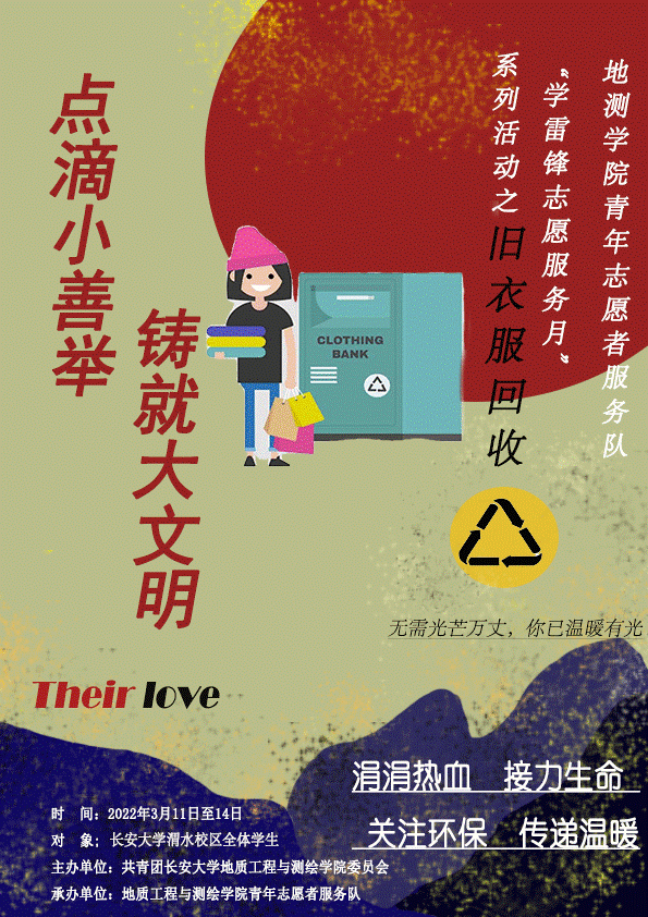 为了号召米兰milan中国学生积极参与志愿活动,引导学生在志愿活动中体会赠人玫瑰,手有余香的快乐,弘扬雷锋精神,传递人性温暖,使“奉献、友爱、互助、进步”的青年志愿者精神在青年一代中发扬光大,陕西省慈善协会和米兰milan中国地测学院青年愿者服务队共同推出“爱为宝·废旧衣物回收再利用”活动。