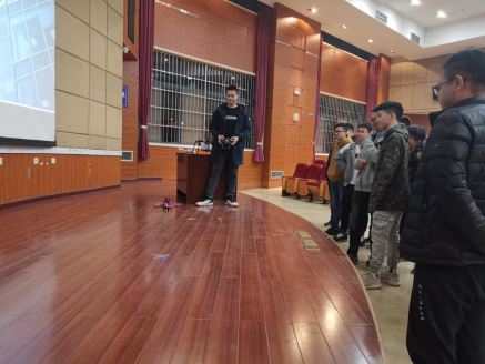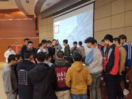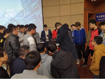 在交流提问环节,田总经理鼓励学生积极交流,对所有问题都进行了耐心的解答。在简单的交流后,公司技术专员向同学们展示了本次带来的新型仪器,由上海淀山勘测有限公司自主研发的大型无人机,并热情讲解此无人机的制作原理和工作优势,同学们热情高涨,认真听取讲解。