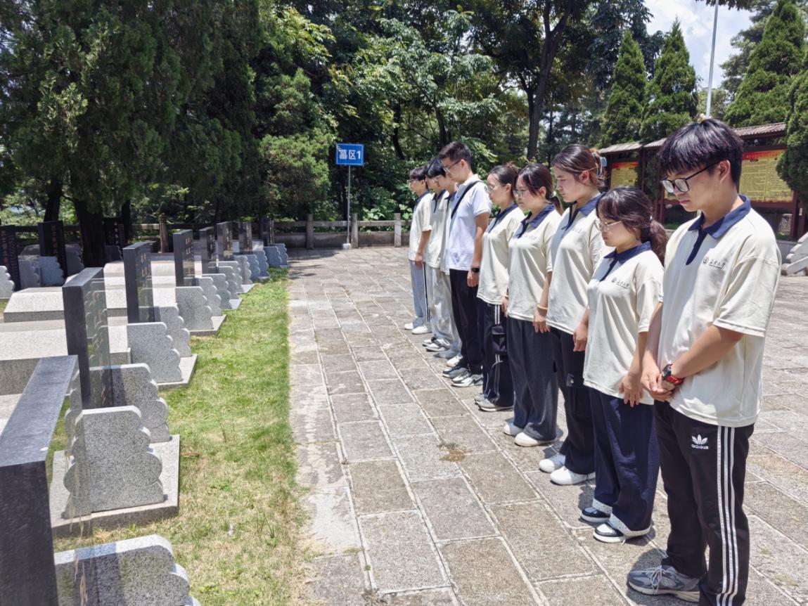 步入依山而建的烈士墓区,庄重肃穆的氛围更加深沉。队员们怀着无限敬仰,轻轻走过一排排静穆的墓冢,俯身仔细擦拭墓碑,再次集体肃立默哀,向为革命事业献出生命的先辈致以最深切的哀思与崇高敬意。