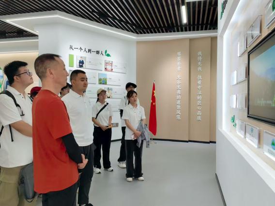 随后,实践队前往商南茶叶博览馆,沉浸式感受双山茶叶的历史厚度与文化魅力。馆内展品丰富多样,多方位展现双山茶叶从起源到现代发展的完整脉络。团队成员重点了解“茶奶奶”张淑珍培育茶叶的奋斗奇迹,她几十年如一日坚守为民服务的初心,在北纬33°的商南秦岭大山里创造了 “茶青漫山坡”的景象,让商南成了年产茶叶6500吨,产值10亿元的产茶大县,使商南山区的贫困群众走上致富之路。通过文物观赏、多媒体互动体验,实践队成员们直观认识到茶叶在当地经济社会发展中的支柱地位以及在文化传承中的重要意义。
