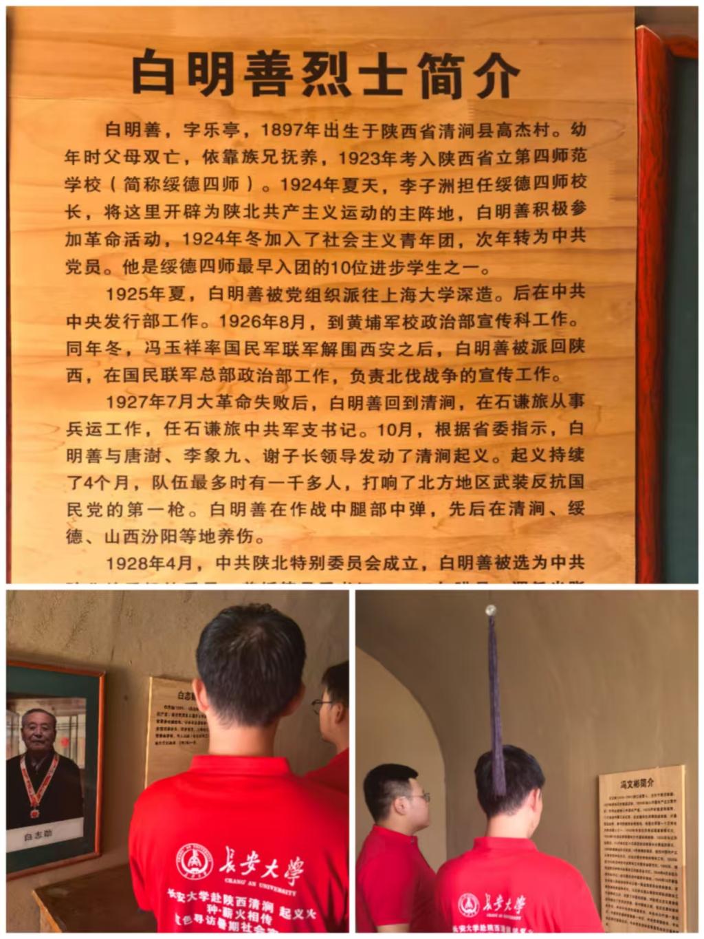 在白明善烈士故居庄严的大门前,实践队采访了故居的义务讲解员,深入了解这位“陕北革命引路人”的成长环境、其故居保护修缮的历程以及高杰村群众对这位英雄六叔的深切缅怀与精神传承。置身于此,队员们深刻感受到,这朴素的院落不仅是烈士曾经居住的地方,更是一个诠释早期共产党人初心使命、播撒革命火种的精神原点。此次学习为实践队后续结合红色资源挖掘,助力乡村振兴提出建设性方案提供了鲜活的第一手资料和深刻的情感积淀。队员刘笑杭感叹道:“从白明善烈士壮烈的一生中,我们学到的最核心精神就是:对崇高理想和信仰的无限忠诚,以生命诠释共产党人坚贞不屈的气节!”