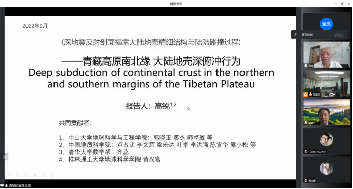 2022年09月20日下午,中山大学高锐院士及师卓璇博士受邀以线上会议形式为地测学院师生分别做了题目为“青藏高原南北缘大陆地壳深俯冲行为”和“拉萨地体地壳构造叠置与班公湖-怒江洋双向俯冲——深反射地震剖面的揭露”的学术报告。彭建兵院士、李振洪院长、邵广周副院长及地测学院百余位师生参加了本次报告会。报告会由地测学院地球物理系系主任包乾宗主持。