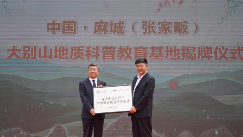 范文代表学校为专业学位研究生产教融合联合培养基地授牌。他指出,彭建兵院士充分发挥学校学科特色和科研力量,带领团队投入教育基地和文化村建设,为基地的建成倾注了大量心血,希望通过建立研学基地,推动校地双方在人才培养、科学研究、科普教育等方面开展深入合作,把地质科普馆建成重要的育人平台、文化建设的“主阵地”、对外交流与形象展示的“新窗口”、社会科普教育的“打卡地”和深受群众喜爱的“新地标”。
