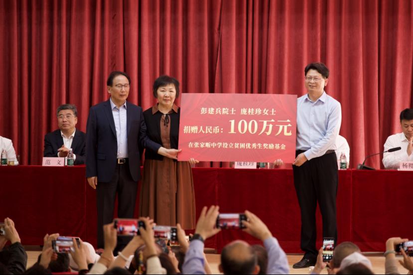 4月22日下午,彭建兵院士携夫人庞桂珍女士向母校张家畈中学捐赠人民币100万元,设立贫困优秀生奖励基金,奖励资助品学兼优的贫困学生,鼓励他们奋发图强、为国家和社会建功立业。范文、刘大锰、麻城市副市长张星及相关专家学者出席捐赠仪式。