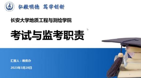 为保证考试监考工作顺利进行,3月30日地测学院安全工程系线上组织召开教师监考职责培训会。地测学院副书记副院长荆琳、副院长邵广周、专业建设及教学秘书赵梓余,以及安工系全体教师参加了本次培训会。会议由安工系副主任李凯玲老师主持。