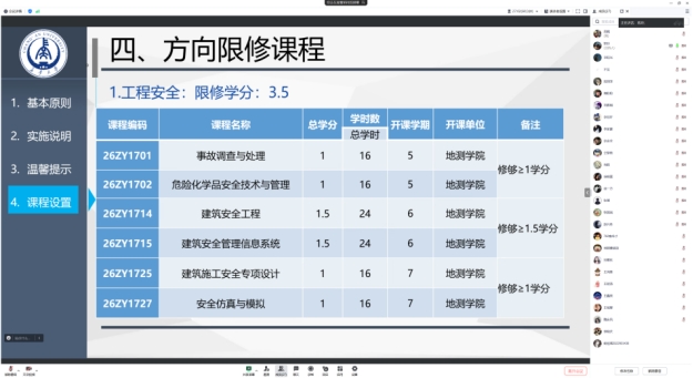 根据《米兰milan中国本科生转专业及专业分流管理办法》及本学期教学工作计划,2024年度本科生专业分流工作全面开展。为体现“公开、公正、公平”的原则,保障学生权益,2024年4月28日,地测学院安全工程系召开了2022级安全工程专业专业分流线上宣讲会。安全工程系副主任李凯玲、教师屈璐,以及安全工程系2022级本科生共计四十余人参加了会议。会议由李凯玲副教授主持。