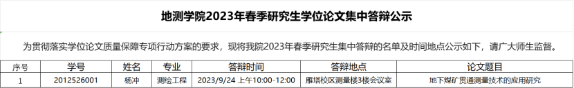 为贯彻落实学位论文质量保障专项行动方案的要求,现将我院2023年春季研究生集中答辩的名单及时间地点公示如下,请广大师生监督。